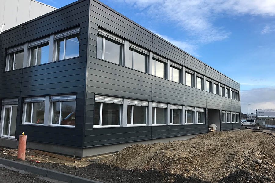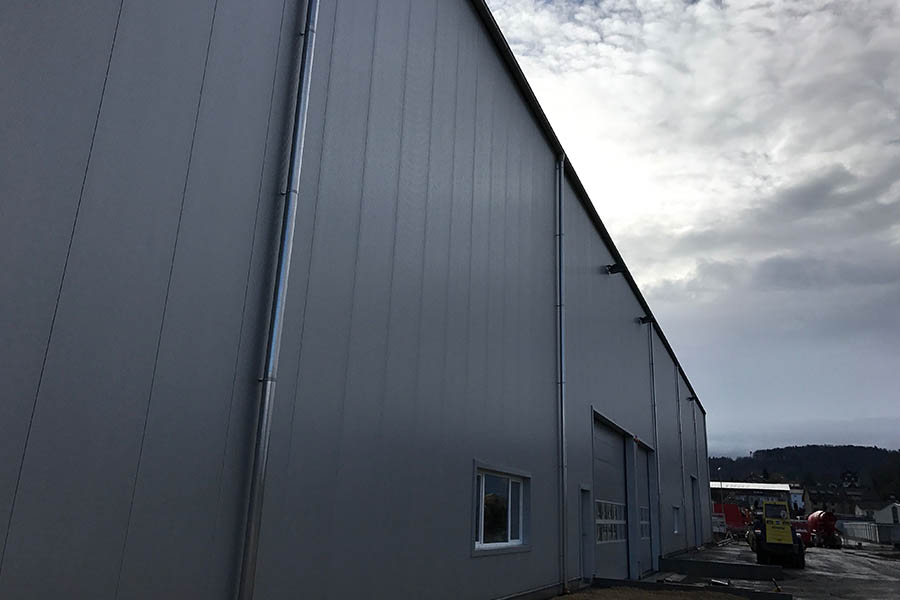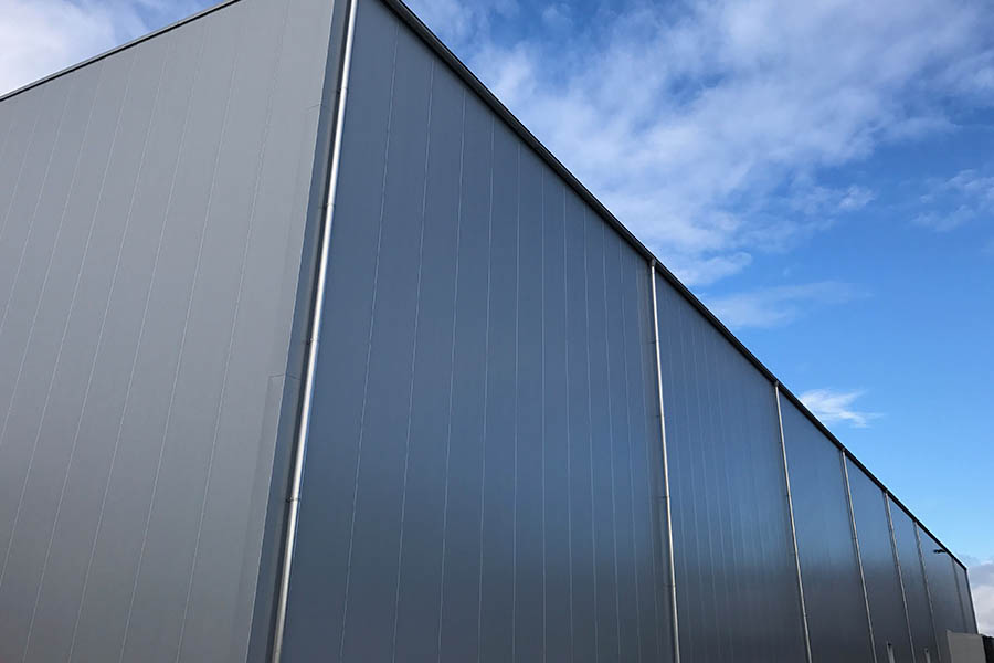 Descriptif des travaux Halle de stockage complète en panneaux sandwich, une cloison intermédiaire coupe-feu et façade ventilée Montaline.